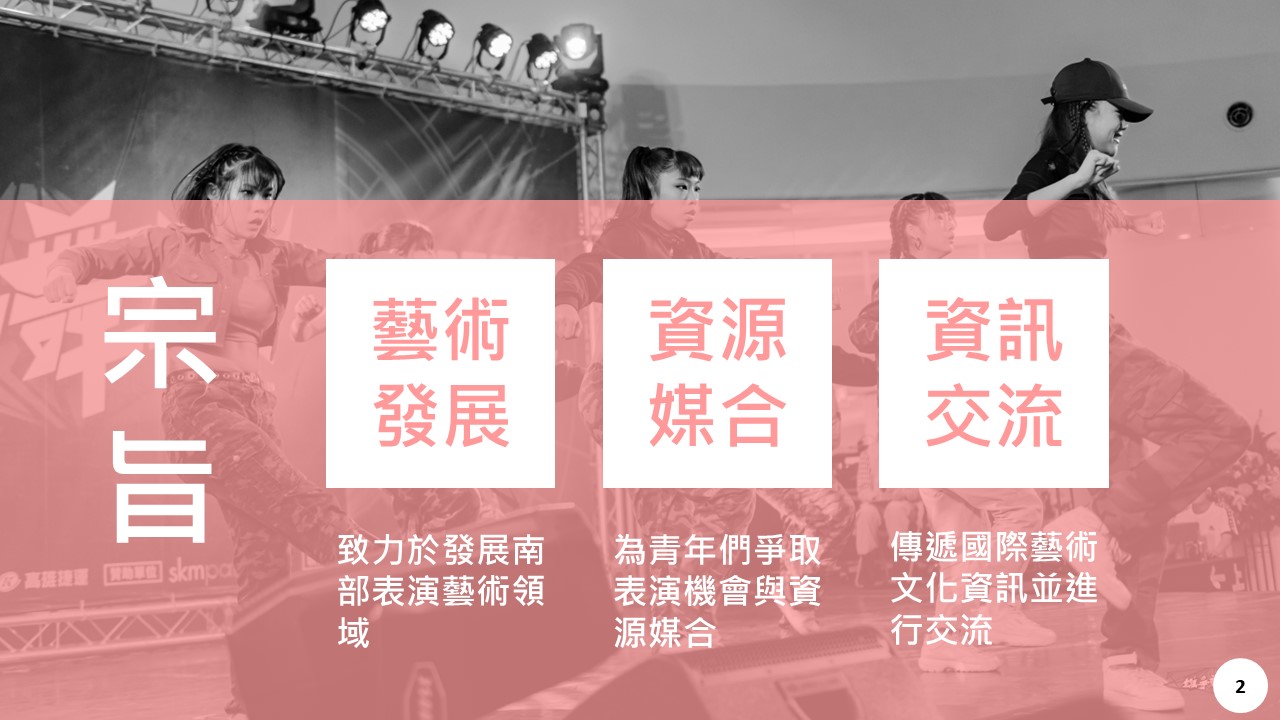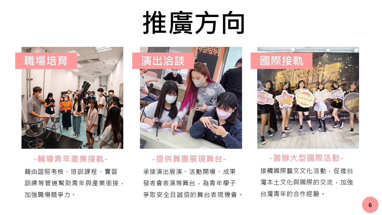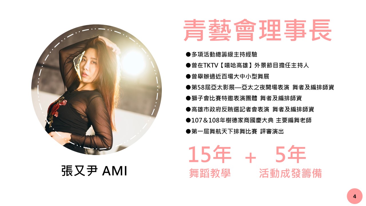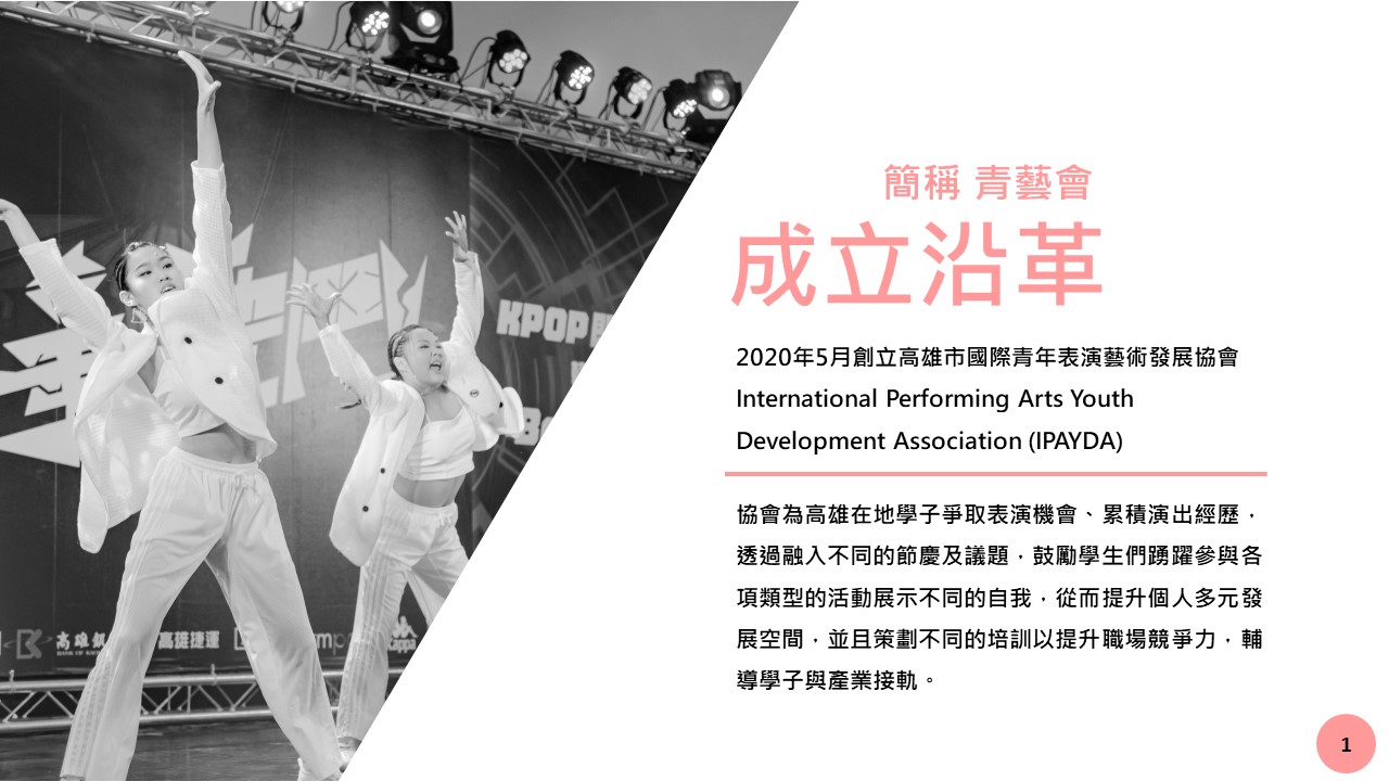 為了將表演藝術的文化,推廣到更多地方,以高雄市尼亞斯舞蹈表演藝術學院(Nias Dance Studio)為據點,成立國際青年表演藝術發展協會(International Performing Arts Youth Development Association),致力於南部表演藝術發展、為青年爭取表演機會及資源、與國際藝術文化進行交流和資訊傳遞等表演藝術相關資源整合。