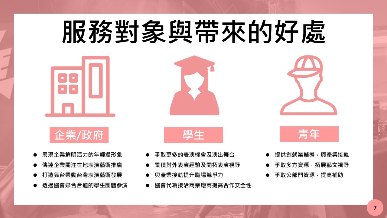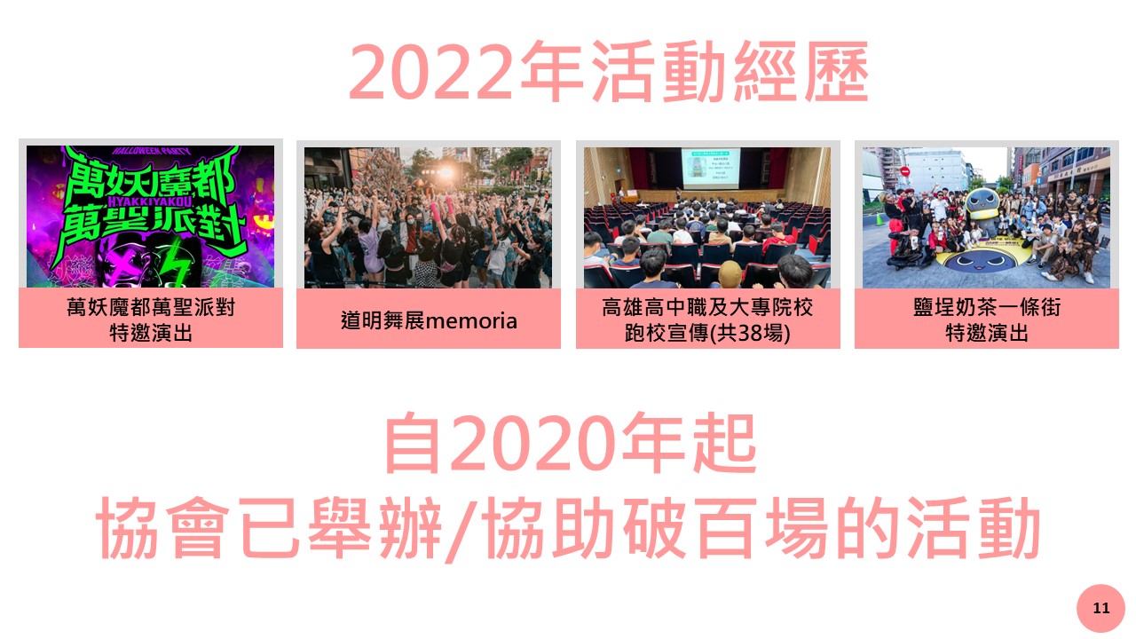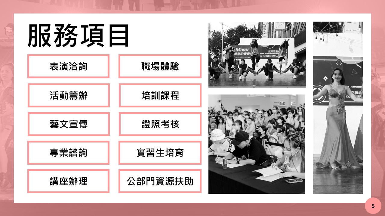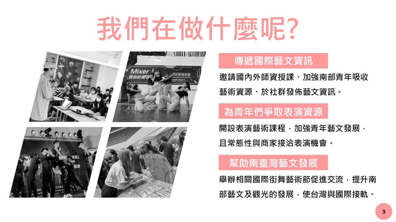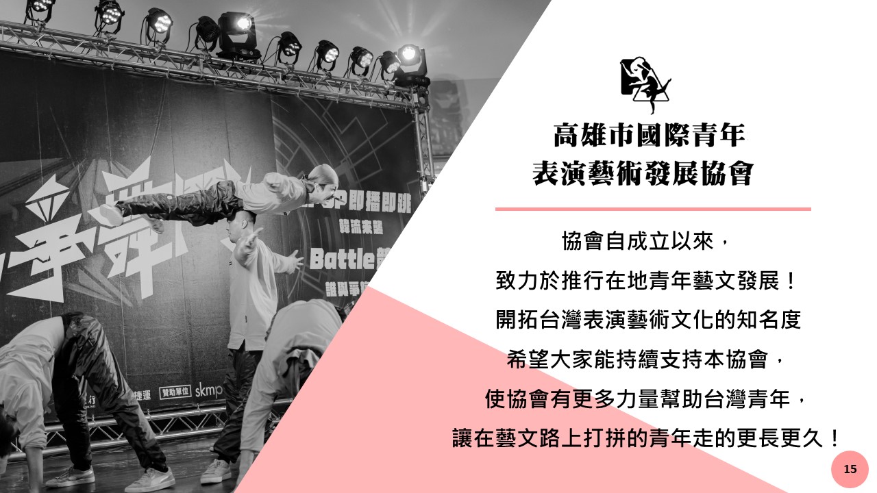 為了將表演藝術的文化,推廣到更多地方,以高雄市尼亞斯舞蹈表演藝術學院(Nias Dance Studio)為據點,成立國際青年表演藝術發展協會(International Performing Arts Youth Development Association),致力於南部表演藝術發展、為青年爭取表演機會及資源、與國際藝術文化進行交流和資訊傳遞等表演藝術相關資源整合。